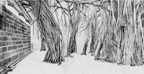 『光らびた村』PATTAMANGALAM-精神世界=13 大樹祭5 ともあれ、うら若き乙女たちが美しいサリ―を着て一心に大樹を巡る姿には胸をうつものがある。バニヤンは、たれ下がった枝がそのまま地について根となり横へ広がってゆくだから一口に一周するといっても100メ―トル以上はある。単純計算してもなんと10キロ。小走りでまわっていた娘もしたから、これは並のジョギングなんてもんじゃない。しかも最後の一周は、かかととつまさきをつけるようにして歩かねばならないわけだから高度な持久力と集中力が要求される。信仰力の勝利なのだ。