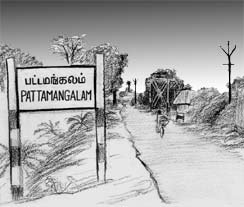 『光らびた村』PATTAMANGALAM-02 村の入口 村の名前を記したプレートが見えてきた。 その名は『パッタマンガラム』。 タミル語で「枯れた女たちの里」という意味だ。 さあ、いよいよ村の探検を始めよう。 シュワッチ!