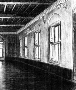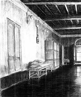 祈りの間の隣には、広いダイニングホールがあります。ここは、普段は休息や就寝の部屋ですが、祭礼の際に数百人のお客をもてなす「食事の空間」となります。