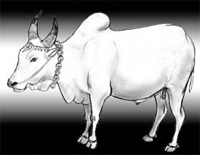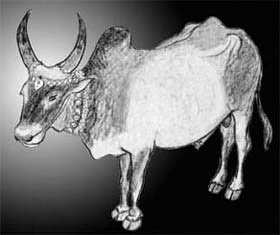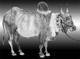 我がパッタマンガラム村代表の寺院牛。かなり獰猛な性格で、絵を描いただけでも興奮していました。 これも我がパッタマンガラム村代表の寺院牛。祭の何日も前に牛飼い人がはるばる連れてくるそうです。