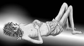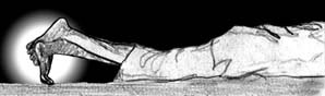 左の絵は、カルカッタのハウラ駅のホームで寝ている少年のスケッチです。駅構内で暮らしているのでしょうか。何も敷かずに平然と眠っていました。その傍らでは、おじさんが絶妙なバランスで足を組んだまま、熟睡していました。インド人の長くて細い手足には、味わい深い「表情」がにじみ出ているような気がします。
