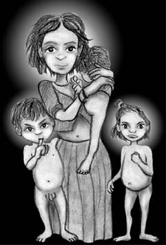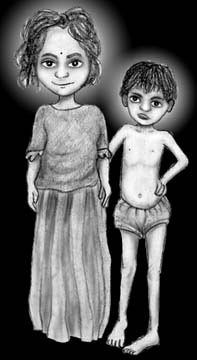 | マドラスの下町、パリス地区の路上で暮らす子供達。赤ちゃんは怖がって泣いてしまいましたが、しっかり者のお姉ちゃんの笑顔が印象的でした。 | これも、同じ場所で出会った姉弟。左の子供達との関係は不明です。初期の頃のスケッチなので、かなりマンガ的ですが、雰囲気は伝わっているかも。 |