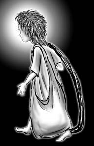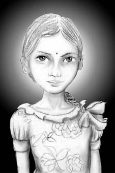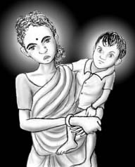 | マドラスの路上で出会ったお母さんと息子。タミル語で「エルトゥ・コンデ・ポイ、エンナ・セイワイ?」と語りかけてきました。意味は調査中です。 | マドラスの路上でみかけたタイヤと荷物をひきずるように持ち運んでいた少女。とっさのクロッキーなので、この程度の仕上げしかできません。もっと動きがあって「ケナゲ」だったのに。 |