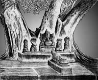 木陰にひっそりと佇むGanesh(象神)とNagar(蛇神) 南インドの農村、PATTAMANGALAM村で暮らした延べ一年。 そこで垣間見たタミルの世界には、濃厚なヒンドゥ―教のフィルタを通して、 なにやら得体の知れない土着信仰が脈々と生きづいているのが観えた。 ここには、古(いにしえ)のインドがある…と思った。