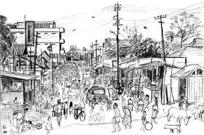 この絵は夕方の時間帯だが、明け方はまだ開いている店も少なく、ひっそりとした通りを、ただ黙々と沐浴場に向かう人々の姿は一種異様な光景である。昼は賑やかな観光地も朝は敬けんな聖地となるのである。メイン・ストリートの奥に見えるのが、処女神クマリを祀るSri Kanniyakumari Amman Templeだ。
