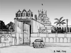 Sri Kanniyakumari Amman Templeの入口は、珍しく北側にある(最南端の寺院だからしかたないか)。北門の向こうにこじんまりとそびえているのが、門塔Gopuram。他の壮大な造りの寺院に比べて、いたってシンプルな造りだ。門塔は南インドのドラヴィダ様式の寺院に見られる特徴的な建造物で、表面は様々な神様の像で埋め尽くされている。最も高い門塔は、タミル平原の中央部、ティルチラパリTiruchirappalliの寺院都市シュリーランガムSrirangamに建つ高さ75mに及ぶ巨大なものだ。