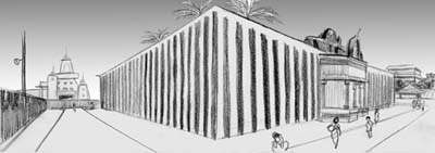 Templeの南東側。右手中央が本来のメインゲートにあたる東門。これも昼下がりの絵なので人はまばらだが、明け方は人々の行列が画面右手奥から押し寄せてきて、まっしぐらに岬広場の突端にある沐浴場へ向かう。左奥にはGhandhi