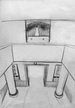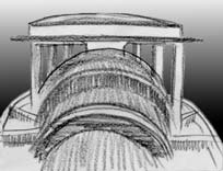 記念堂の最上部より見下ろした海に突き出た馬蹄形のホールの屋根。デッサンが狂っていますが、悪しからず。