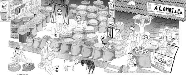 一番品揃えの良さそうな穀物問屋に何日も通いつめて、店先に並ぶ商品を写真に記録した。 布袋に入っているのは、その多くが香辛料である。 ここケーララ地方は、香辛料の故郷。 古来から国際貿易港として栄えていたエルナクラムだが、 1502年のヴァスコ・ダ・ガマの来訪以降、ポルトガル、オランダ、イギリス等に支配され、 動乱と苦難の時代をくぐり抜けてきた。 現在は、インド国内で生産される胡椒の年間輸出量3万5000トンの大半を牛耳る胡椒貿易港である。