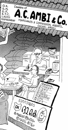 奥にいるのが、店の主人。その手前がマネージャー。どこの店もこんな配置で座っている。 この絵は1982年に描いたものだから、今頃は、電話機もプッシュホンになって、傍らにパソコンなんかがあったりして(それはないか...) 手前の看板は、牛用の飼料。文字はケーララ州の公用語マラヤーラム語。隣の州のタミル語は少し角ばっているが、マラヤーラム語はテルグ語とならんで、丸っこいのが特徴。 絵を描くように文字を書き写しただけなのに、「お前はマラヤーラム語の読み書きができるのか!」と感動されてしまった。