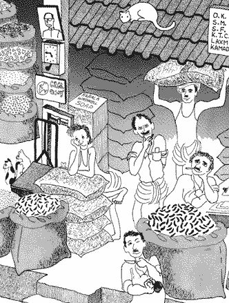 時計は針は、そろそろ午後5時を示している。手前のあんちゃんは、チャヤ(MilkTea)を受け皿に移してちょうど飲み終わったところかな。 この絵は、夕方のひと働きが始まる前のくつろぎのひとときを描いたもの(メインのストーリーとは時間軸がずれてしまうけど、勘弁してつかあさい)。 屋根の上や店内にもネコがいて、ネズミを狙っている。僕はインドに来て以来、この地で初めてネコを見かけた。犬は全インド的にそこら中にワンさかいるが、こんな感じで、ネコの自然な姿と出会えるのは、実は珍しいこと?(インドのネコ事情に詳しい方いませんか?) 港町エルナクラムには餌となるお魚がいっぱいある。フォート・コーチンのチャイニーズ・ネットで漁をしている所に行くと、魚目当ての野良猫がうじゃうじゃいるのであった。 |