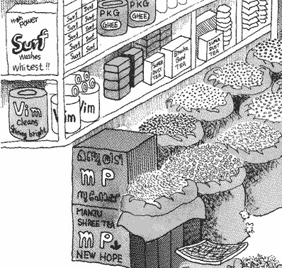 問屋の棚に積まれた商品の数々。洗濯洗剤サーフSurfは超有名。紅茶やギーGHEE(精製バター油)といっしょに何で洗剤があるのか、ちと不思議。ビニール袋入りの香辛料もあった。ネズミも顔を出している。