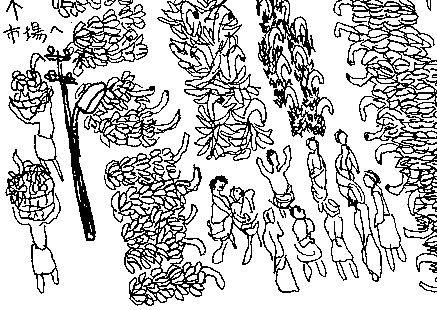 広場の真ん中では、業者が集まって競りが始まっていた。左からマイソール・バナナ、コーチン・バナナ、モンキー・バナナ、グリーン・バナナの順に並んでいる。競りおとされたバナナは、人夫たちがカゴに入れて野菜市場内に運ばれる。 それにしても下手な絵ですみませんm(_ _)m