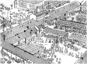 流通の核は市場である。市場には香辛料も含めて、あらゆる食材が集まっていた。まずは、問屋や商店の種類別の配置図を書き、市場総合品目調査を開始した。そこで取り引きされている野菜・肉・果物等々の生鮮食料品をはじめ、米や穀物類・香辛料・調理用具等々の名称・形状・価格などを写真とスケッチに記録した。ここまでは、前回のインド行の記録方法を踏襲しただけだったが、約1ヶ月後、「いっそ、まるごと鳥瞰図で描いてみよう!」と突然思い立ち、上空数十メートルから市場を見下ろした構図で描き始めた。