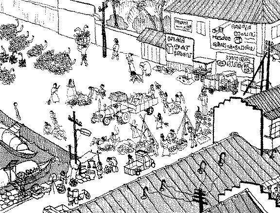 午後のバナナ広場には、のどかな時間が流れている。清掃用のトラクターがやって来て、おば ちゃんや兄ちゃんたちが、生ゴミやカスをきれいに掃いてくれる。通り沿いには、露天が店開 きして、夕刻の商いの準備が始まった。