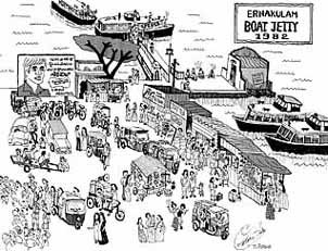 エルナクラムの交通の中心−それは舟着き場=JETTYです。ここを基点にして、コーチン湾に点在する入り江や島々を往来する船が発着しています。もちろん、ローカル・バスもありますが、かなり遠回りになってしまうのです。水上交通は、水と緑のケーララならではの、いくつかの主要なJETTYが点在していますが、フォート・コーチンFort Cochinやヴァイピン島Vypin行きのフェリーが発着するこの船付き場が最も賑やかです。朝夕は通勤の人々でたいへんなラッシュになります。