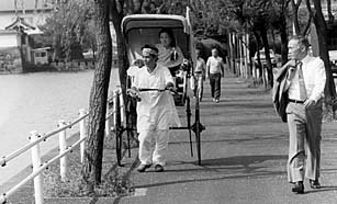 ![]() 1986年、処女作「インドを食べる」発刊の宣伝のため、カルカッタの人力車(岩瀬一郎氏所有)にカミさんを乗せて皇居前を走る。林 朋彦氏撮影。当時の体型に戻るため、現在鋭意ダイエット中!(@_@) |
