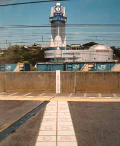 | 三陽電鉄「人丸前駅」のホームには日本標準時子午線の東経135度ラインが引かれています。同ライン上にあたる道路などにも同じく標識が立っていました。天文科学館はその標識の役割を担っています。 |