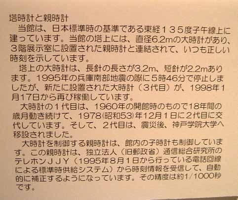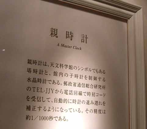 | 天文科学館の親時計です。子午線に建っている科学館だけあって郵政省通信総合研究所の時刻コードを受信して自動的に時計の進み遅れを補正するそうです。私の勤める職場のビルにも親時計があって、ビル中の壁掛時計を制御しています。「親時計−子時計」は学校の時計などにシステムとして導入されていることが多いですね。 |