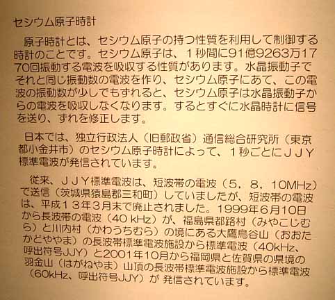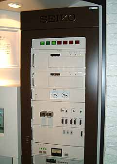 | セシウム原子時計です。電話の時報も、電波式の腕時計で受取る時間情報も、おおもとはこのセシウム原子時計ではじかれています。詳細は以下。 |