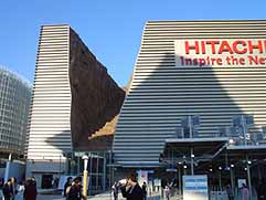 | 企業のパビリオンはどれも趣向を凝らしたものが多いですね。日立館は渓谷の川、滝をイメージ。実際水が流れてきます。企業パビリオンの中では一番楽しい建物かもしれません。 |