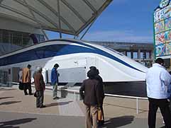 | これは最新のリニアモーターカーの実物。想像していたよりも大きいです。新幹線と同じくらいでしょうか。 |