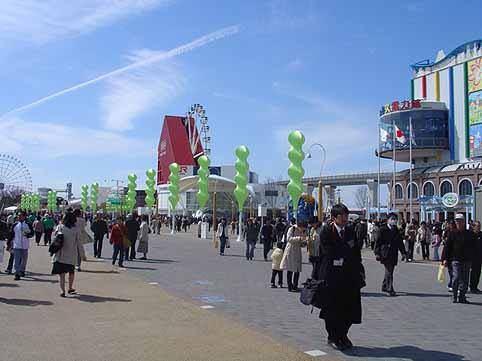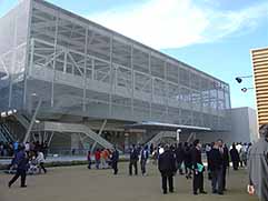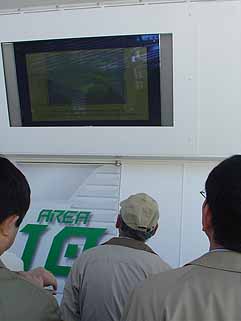 | 写真は映画の一場面。こういったCG俳優の顔に自分の顔がハメ込まれ、CGとなった自分は不自然なく演技します。この技術は完成度が非常に高く、カナリ面白い。私が足を運んだパビリオンの中では一番楽しめました。これを応用、CGで「冬ソナ」を作って、自分が登場人物になれる“商品”を作ったら爆発的に売れるでしょうね。 |