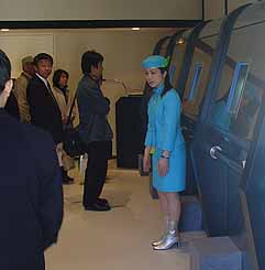 | アテンダントのお姉さんが顔面スキャナーの仕組みを説明。誰がどのキャストになるかはコンピューターが自動で決定します。主役になれるか? |