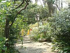 | これが江戸時代の屋敷の雰囲気なのでしょか? 変わった亜熱帯植物が沢山生えています。一方で日本庭園の雰囲気も。異空間であることは間違いありません。 |