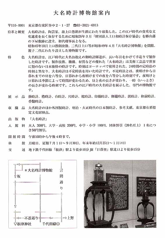 館内は30畳ほどの広さでワンフロアという感じ。櫓時計が多いですが、他にも和時計が数種類展示されています。私が訪ねたときは見学者は私ひとりで、薄暗い館内は静まり返り、時が止まっているような雰囲気でした。 これらの“大名時計”を収集した上口愚郎については「谷根千ねっと」の古書ほうろう『嗤う茶碗 野人・上口愚朗ものがたり』 に詳しいです。下駄やラジオ、古陶磁などもコレクションしていた方のようです。 |