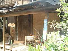 | 門を過ぎると、東京の都心とは思えないほどの広い敷地に樹木がうっそうとしています。物置きのような建物には何故か「両替」の木製看板が。 |