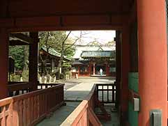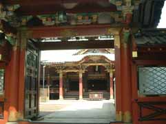 | 正面にあるのが総漆塗りの社殿です。国指定の重要文化財で、江戸の神社建築としては最大の規模を誇っています。 |