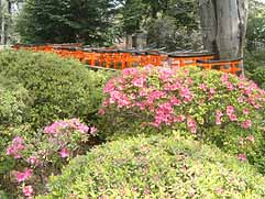 連続する鳥居をくぐっていくと乙女稲荷神社の境内があります。つつじや藤の花に囲まれた可愛らしい社殿はいかにも“乙女”。 一方で江戸時代に根津神社境内にあった遊廓と関係があるという話も、、。 |