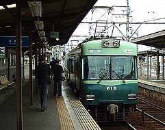| 路面電車のような京阪石山本線。ほとんどが無人駅なので車掌さんがホームにおりて切符を受け取ります。ローカル電車は旅の気分を盛り上げますね。車窓から眺める山々と琵琶湖に郷愁が漂います。近江神宮前駅から近江神宮入口までは徒歩10分程度。 |