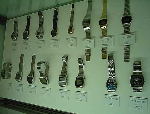 | 一世を風靡したデジタル時計。すべての時計に電池を入れ、液晶を表示させた状態で展示しています。 |