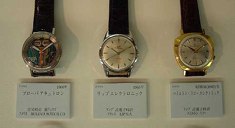 | 短命に終わった各種電子時計。左からブローバの音叉時計、リップの電子時計(電磁テンプ)、ハミルトンの電子時計。 |