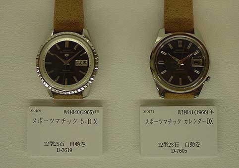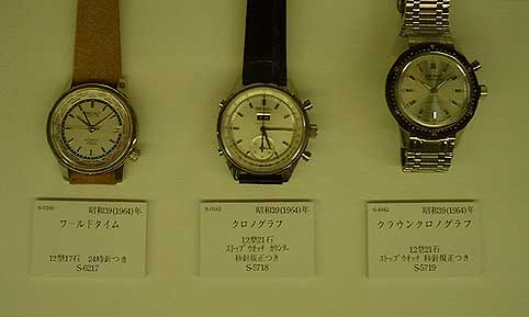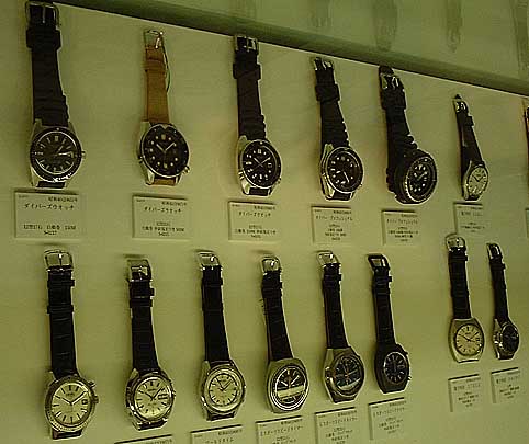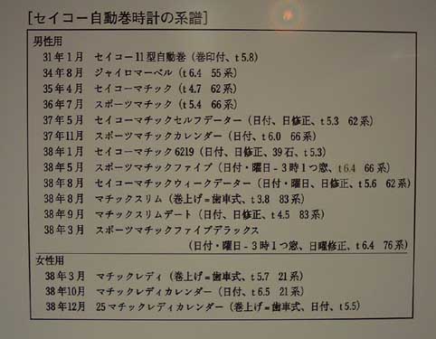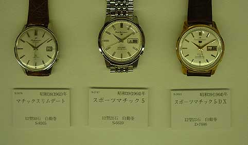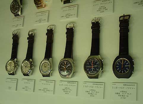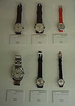 いきなり60〜70年代の時計です。発売年、品名、製品番号、石数など詳細な資料と共に展示されています。 60〜70年代セイコーのスポーツモデルはカッコイイ。 |