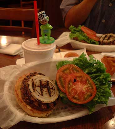 | まずは腹ごしらえ。園内にもレストランはありますが、パークの外にある「CITY-WALK」のほうが手軽なレストラン、ファーストフード店が多いですね。JRのUSJ駅からUSJ入り口の間にあります。ここはハワイアン・バーガーの店。おいしそう。 |