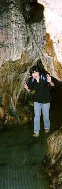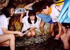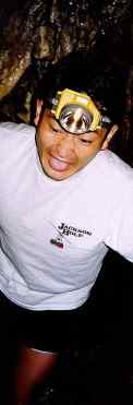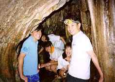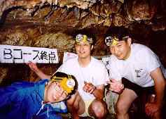 濡れてもいいように更衣室で、短パンにTシャツ、サンダルに着替えるといよいよ鍾乳洞に入っていく。中はひんやりとして肌寒い。普通の格好で行けるAコースをすぎると明かりもなくなり、懐中電灯持って冷たい水の中をザブザブ歩いていく。足もとを流れる水の温度は10℃で足が痛い。足がしびれ切ってしまうまでが辛い。場所によっては四つんばいになったり、人一人やっと通れる所をくぐり抜けたりと、探検隊気分に浸れる。途中水が滴っているところもあり、覚悟はしていたがかなり濡れる。頭も良くぶつけた。