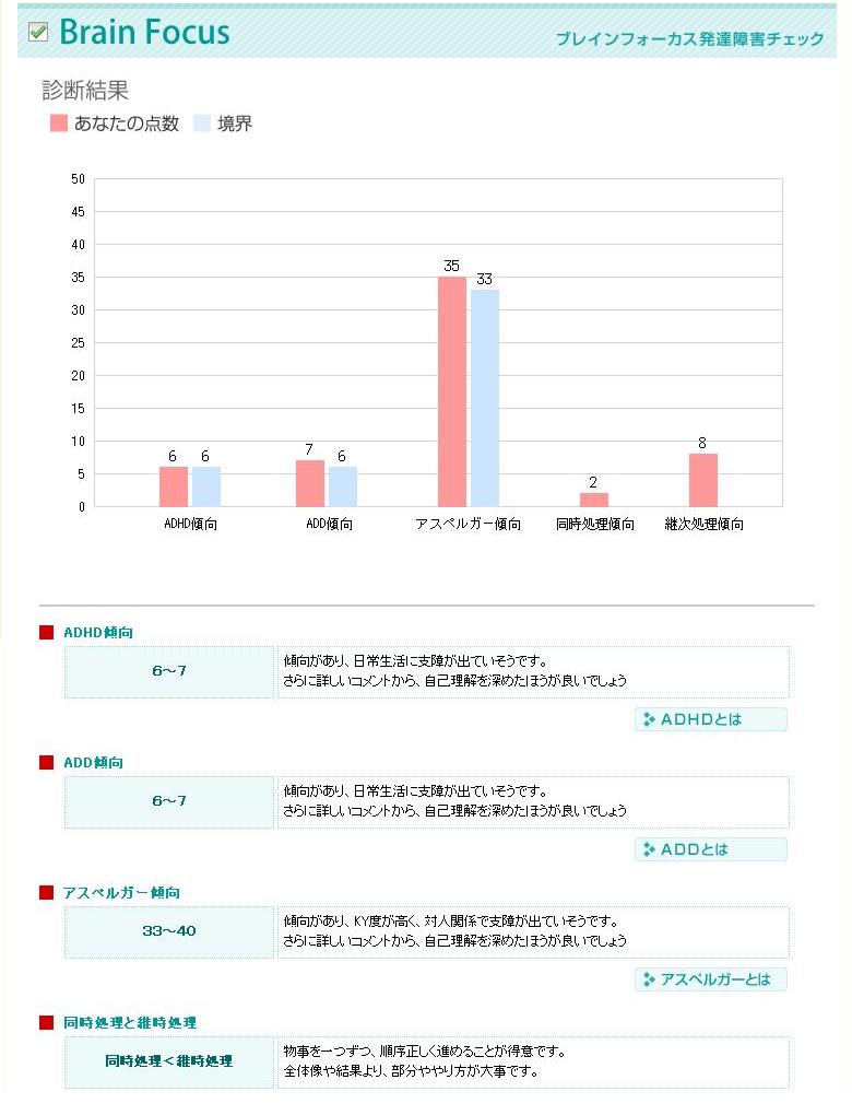 [その他]「発達障害チェック」やろうぜwww やってみた。→結果 どれもこれも「境界」かそれを越えていて、 「傾向があり、日常生活に支障がでていそうです」になってて、アスペルガー傾向に至っては「傾向があり、KY度が高く、対人関係で支障がでていそうです」とまで言われて笑った。笑った… この手のチェックで碌な結果が出た事がないのだが、どこまで本気にしたらいいのやら。いや確かにKYなのは確かなんだけどね…他人様に迷惑かけないように引きこもって暮らした方がよさそうだなあ。