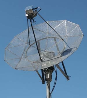 DL7HAR's 1m, f/D 0.45, L-band dish. The geodesic dish is mounted on a smaller offset dish so it is more stable to attached to a rotator.