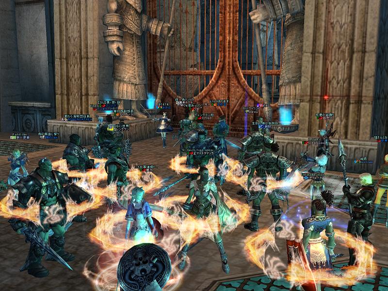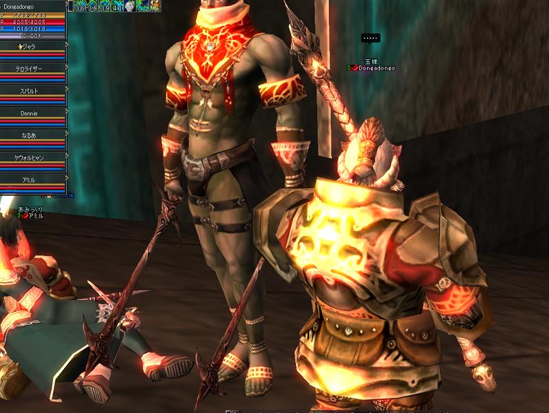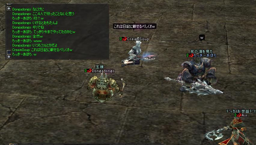決勝はたしかチームゼファ、チームもっこり、チーム白猫ちゃん、チーム師のとこ(どこだったんだろ?)の4チームだったと思う。わちもわりと本気でタタカッテいたのでSSも撮れてないし確認できないが、とりあえず逃げ回って軽くいなしつつ孤立したやつを殴って着実に倒し、最後はチームもっこりの3人vsわち1人でぼこられまくってフレンジー起動!バスカーラをぢごくの道連れにしたもののHPが尽きてあえなくダウン。優勝はチームもっこりとなった。優勝商品ヘビーソードツヴァイハンダーつめあわせギフトセットを送る(購入資金はわちの自腹ではなくDUの血盟資金からでつw)まぁチームもっこりも同盟クランのメンバーなので身内に商品やってもなぁ・・・という気もしなくもないがね^^;どうせなら真ビスケとかが勝てばおもろかったのに。あ、ちなみに八百長とかはありえませんので悪しからず。わしゃいつでも本気じゃーーーーーーーー!!クラメンであろーと真剣勝負で手を抜く&組むやつぁオークの風上にもおけんっ!漢ならコブシでわかりあえぇぇぇぇい!