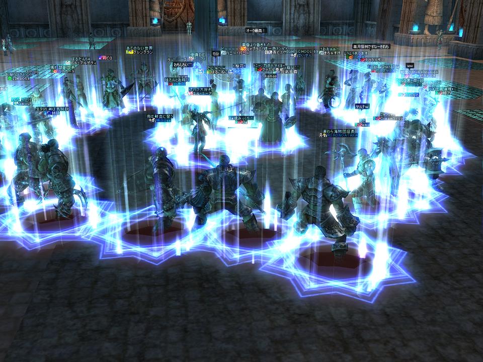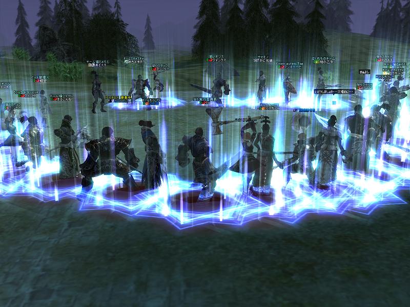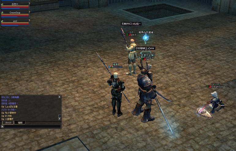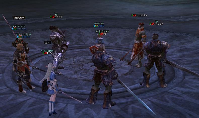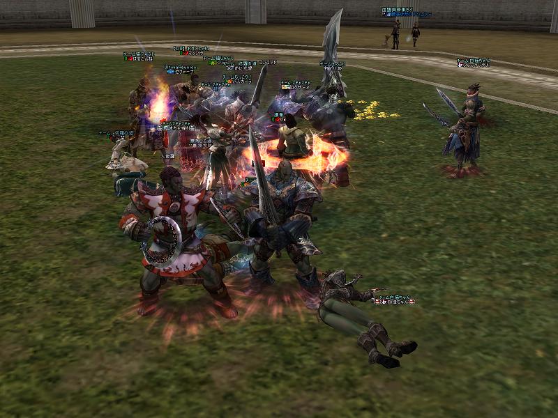 次にその他のメンバーで敗者復活戦をするが、スタッフも参加していいよといってしまったので、スタッフが勝ち残ってしまうwスタッフ同士は攻撃遠慮するからだろうな・・・まぁスタッフ入れたのはわちの判断ミスだったかもしれん。さらにさらに最後に景気よく全員でバトロワをした。討ち取ったり〜とか喋りながら殴りあうのは実に楽しいものだ。E鬼ごっこもそうだが、こういうのが実はわしゃ大好きであるwといって戦争が好きになれんのは、ほとんどが視界外からの1撃で自分がなんで死んだのかわからんという点である。戦争で10回死ぬとして9割はこういう死に方をするので萎える。まぁWIZと弓が主力なので仕方ないんだろうが・・・総督勝負!他のやつは手を出すな!みたいなのが楽しいやん。ま、ムリか^^;