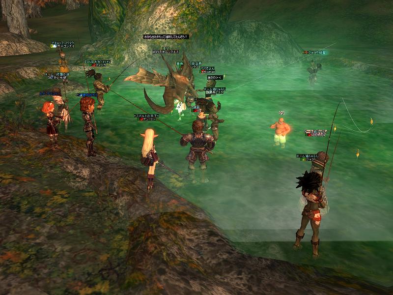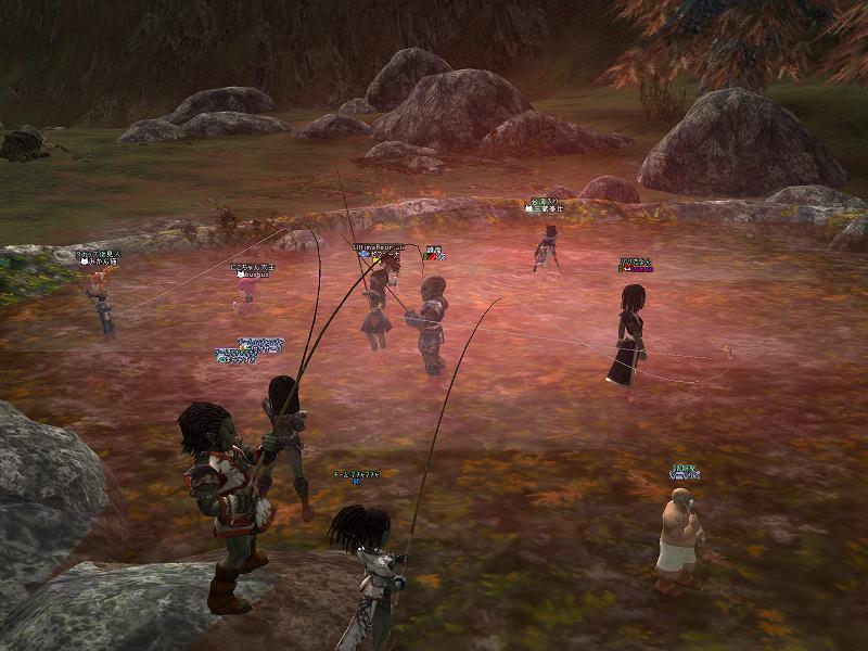 いつもどおりの集合時間にINしてみると、めずらしくジャコウ総督からのWISがくる。「3人しかいね〜ぞ?どうなってんだ」とのこと。どうやら今月は恐ろしく人が少ないようだ。つか、いつも来ねェ総督にだきゃ〜言われたくないぞwやはり内容がマズかったのか?と恐る恐るギラン北門へ行くと確かに少ない。しかし時間オーバーまでシャウトしてるとそこそこ集まってきて、チーム編成すると最終的に8チームくらいになったので上々ではある。温泉地帯にはDUとDTからアン・リー、kamae、スパルト、ジャンクス、クィニーらに審判役として行ってもらってるので、多少少なくなるのはやむをえないともいえる。審判は試合には出ない。ご苦労様である。なお、持ってきてない人もいるだろうから釣竿とエサもしこたまもっておく。
