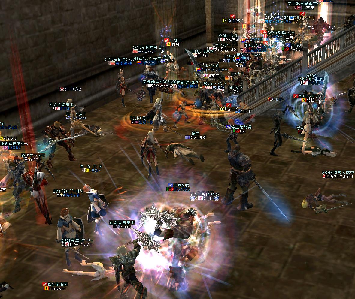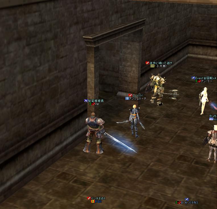 うおおおおと特攻し、敵の目の前でクルッと方向転換。オークのフェイントは実に絵的にいい感じだろう。交感の間へいきこっちの防衛盟主?がすばやく交感。その間わしらは通路を肉壁でふさぎ最後の死守だ。どちらにしてもこれがラストバトル!小太郎タゲ合わせるぞ〜「おう!」・・・そして・・