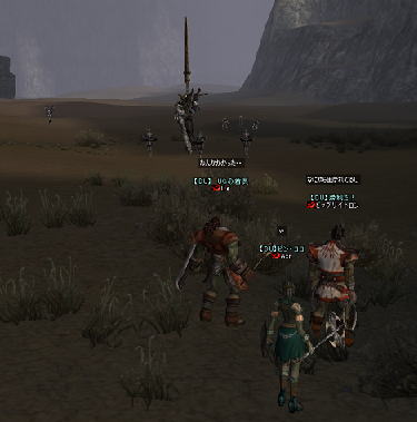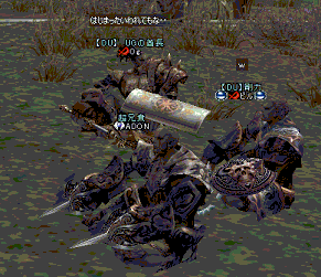 んでこれが12/18傲慢に入れない(ビル兄弟はあえて入らない。儲からないから?w)三オークがしょうがなく巨人の手前で白トラなど狩っていたときの図。実に暑苦しい絵だ。やや保存ミスで変な色になったが・・^^;度重なるサバ落ちで頭に来ていた所だ。実際はAxrも横にいるハードコア(?)なPT構成だ。当然のことだが経験もアデナも決してよくはなかったw