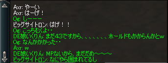 で、これは同じ日かと言うと実は違うw次の日位だったと思われ。野良DVCPTに入れてもらえたので、Axrも呼ぼうと(というか呼んでしまったのだが)したらWCはちょっと・・と言われてAxrを怒らせてしまい、そしてDVC行って壊滅するの図wこの数日は非常にドビ不安定で、ナイト様が動けなくなったり、パイタン2PTひいたりして俺も死亡数回、しかもAxrはむくれるしでロクな日じゃありませんでした^^;すまんアクセル野良PTなどに浮気したと〜ちゃんをユルシテオクレ><(でもまた行くけどなw)