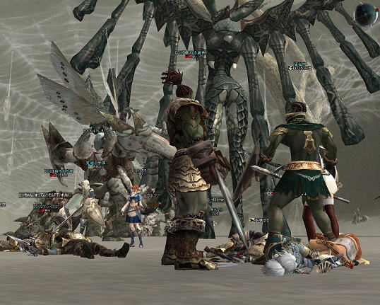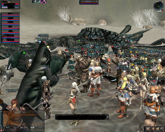 オルフェン自体からの打撃は麻痺以外大したダメージではないが、雑魚に集中浴びるとあっという間にやられてしまう。まずは雑魚からということで、PT単位に雑魚を減らすことにしたが、C1で2発で倒せた雑魚が強いの何の。フルPTでも1匹の雑魚を倒すのにずいぶんかかってしまう。そして麻痺だ。麻痺を消すのもログが流れてなかなか大変。結局、巣から雪崩を打ってでてきた雑魚の一団を始末するだけでBuffは切れ、オルフェンはフル回復してしまうほど時間がかかってしまった。そこで作戦変更。雑魚は無視して、HP50%で巣に戻ったオルフェンを全員で集中攻撃することに決まった。その間の雲霞のごとき雑魚の攻撃はひたすら耐えるのだろうか?どうも無理くさいがやってみるしかない。
