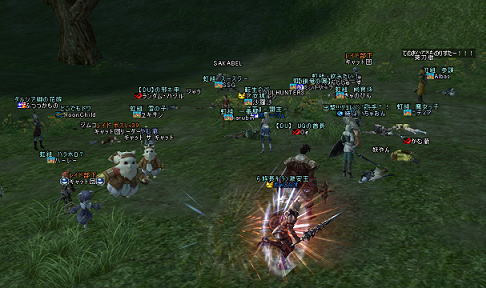 とりあえずAlbasが場所調べてあるらしいので大挙して向かう事になる。ボス自体はあっけなくみつかり、さっそく作戦&バフタイムとなる。ちなみにボスはノンアクなのだ。なにやら町では赤ネがでたとか騒ぎになってるが、まぁ気にしない。ボスの見た目はいわゆる召還ニャンコそのもので、部下が4匹くらいいるようだ。まっ地道にタゲあわせて部下を減らし最後にボスをタコ殴りしかないでしょう。