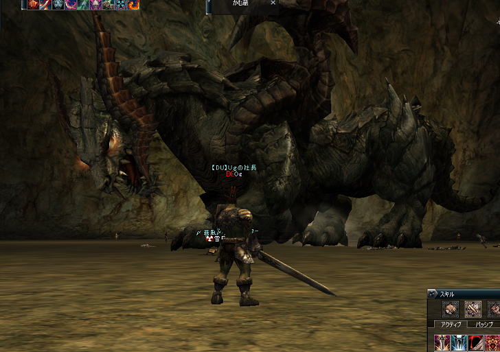 さて・・中にはいるとそこはガラーンとした洞窟。まぁちょっとした野球くらい出来そうな空間である。もちろんいきどまりで、なにやらポッカリと横穴があいており、その穴の前は舞台のように少し高くなっている。実にヤナヨカン。この穴から何も出てこないハズはない。たぶんそれが巣穴?なんだろう。怖いものみたさもあり、即死覚悟で穴の前で暗闇を見つめている事にする。アンタラスは焦らし上手でなかなか姿を現さない。雑魚mobなんかもいないので、みんなマッタリモードだ。アンさんは「端のほうでコソコソしてる〜〜」とかいっていたが、そんなんでかわせるのか?という気はする。なにせ相手はラスボスみたいなもんなのだ。予想ではたぶん、しゃぎゃ〜〜と放射能ブレスかなにか吐かれて一瞬で塩の柱とか、死の灰とかそういう備長炭みたいな使えるリサイクル資源へと変貌させられるのであろう。まさにそうでなければ最強ボスを名乗ってはいけない気がする。ガクブル上等!グレソの一太刀を浴びせ散るがよし、である。ひとしきりダベってまつ事10分、ちとダレかけたところで穴の奥からずんごずんごデカイものが!そして強制出現ムービーが!ついにキタ〜〜〜〜!アンタラス降臨!
